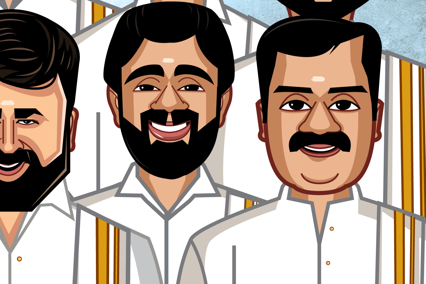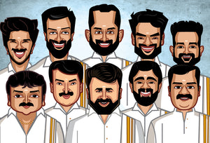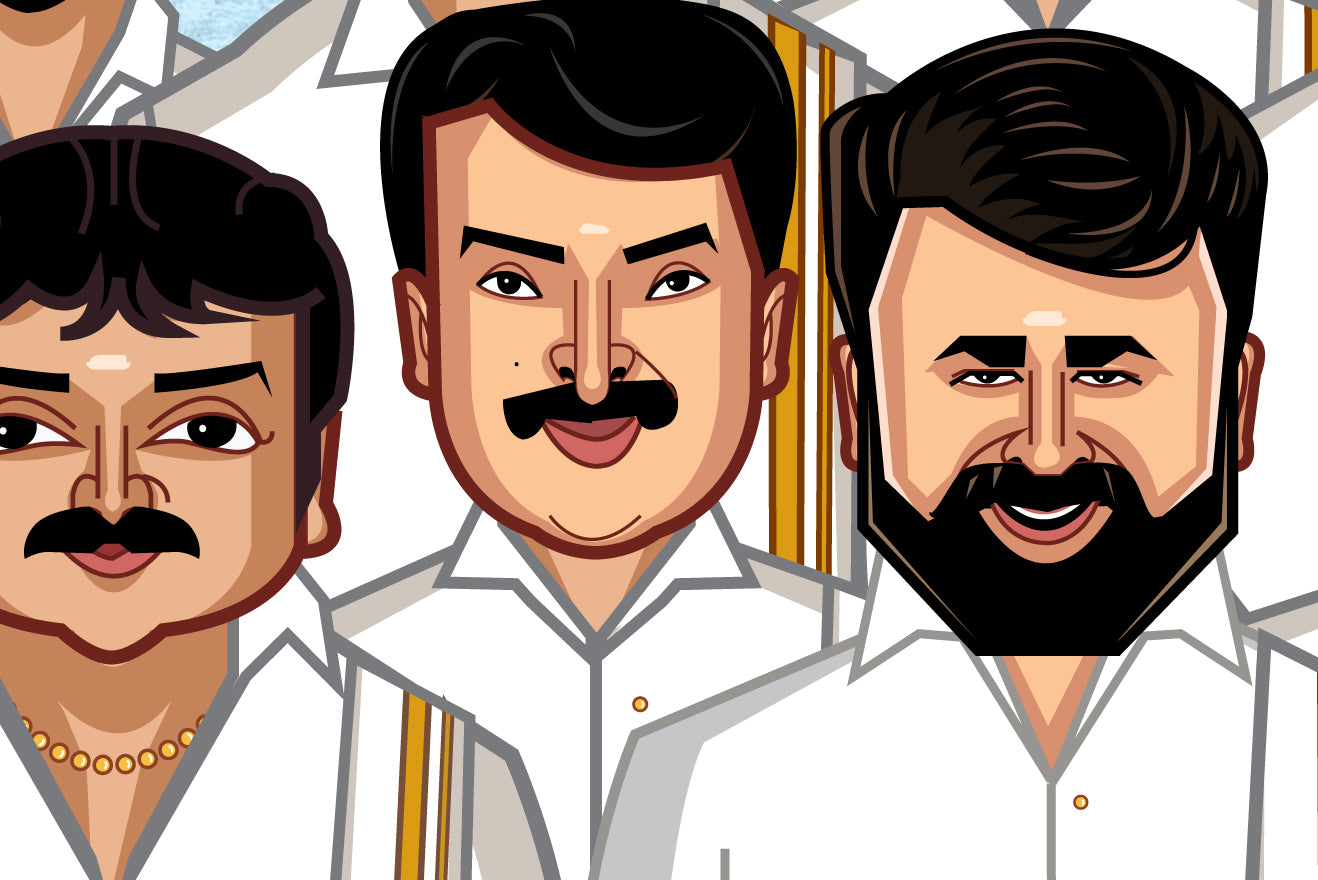 Onam special edition featuring the legendary icons of Malayalam cinema, brought together in one celebratory frame. A tribute to Kerala’s cultural pride with these timeless Mallu legends in traditional attire.