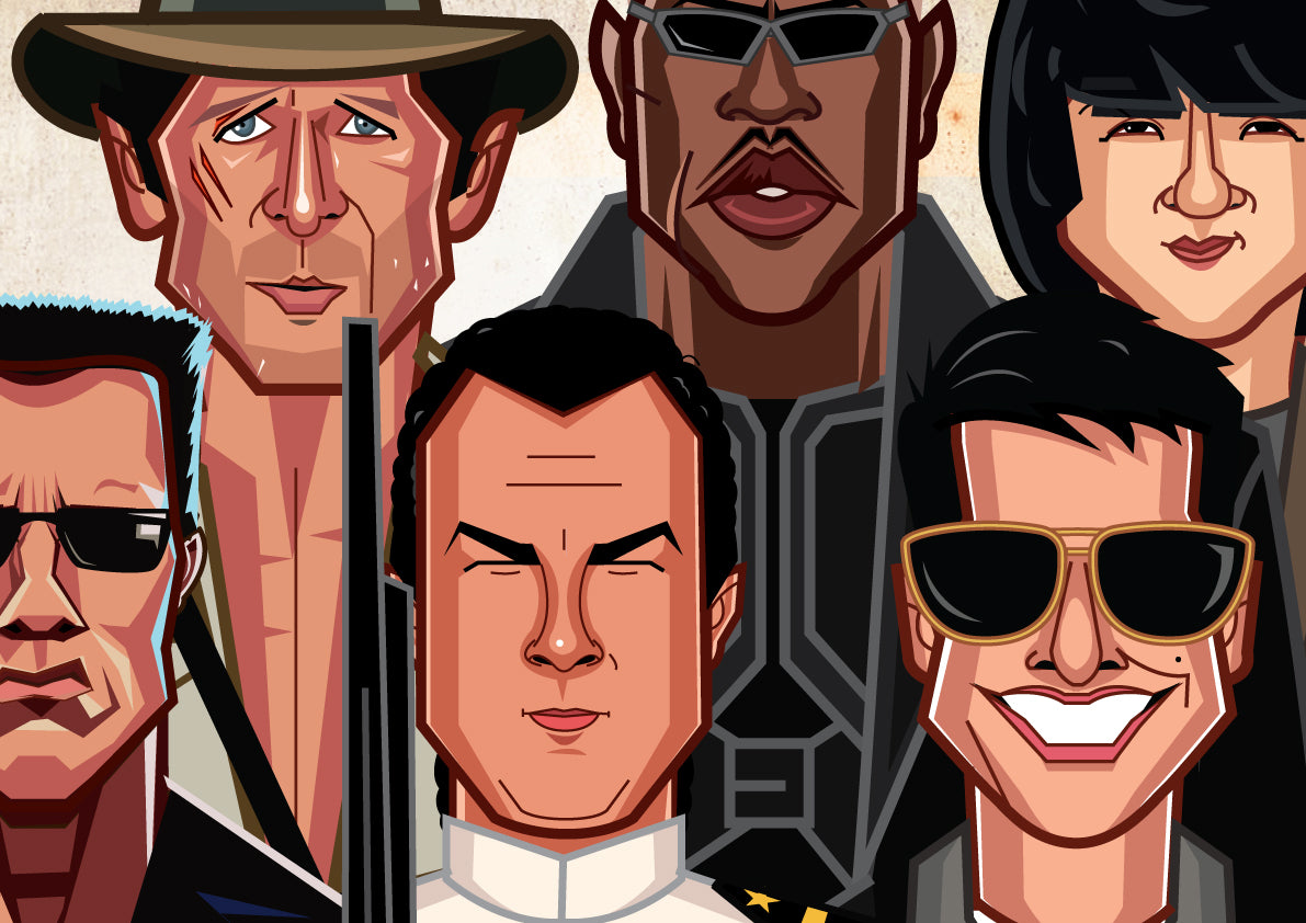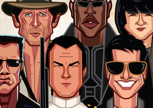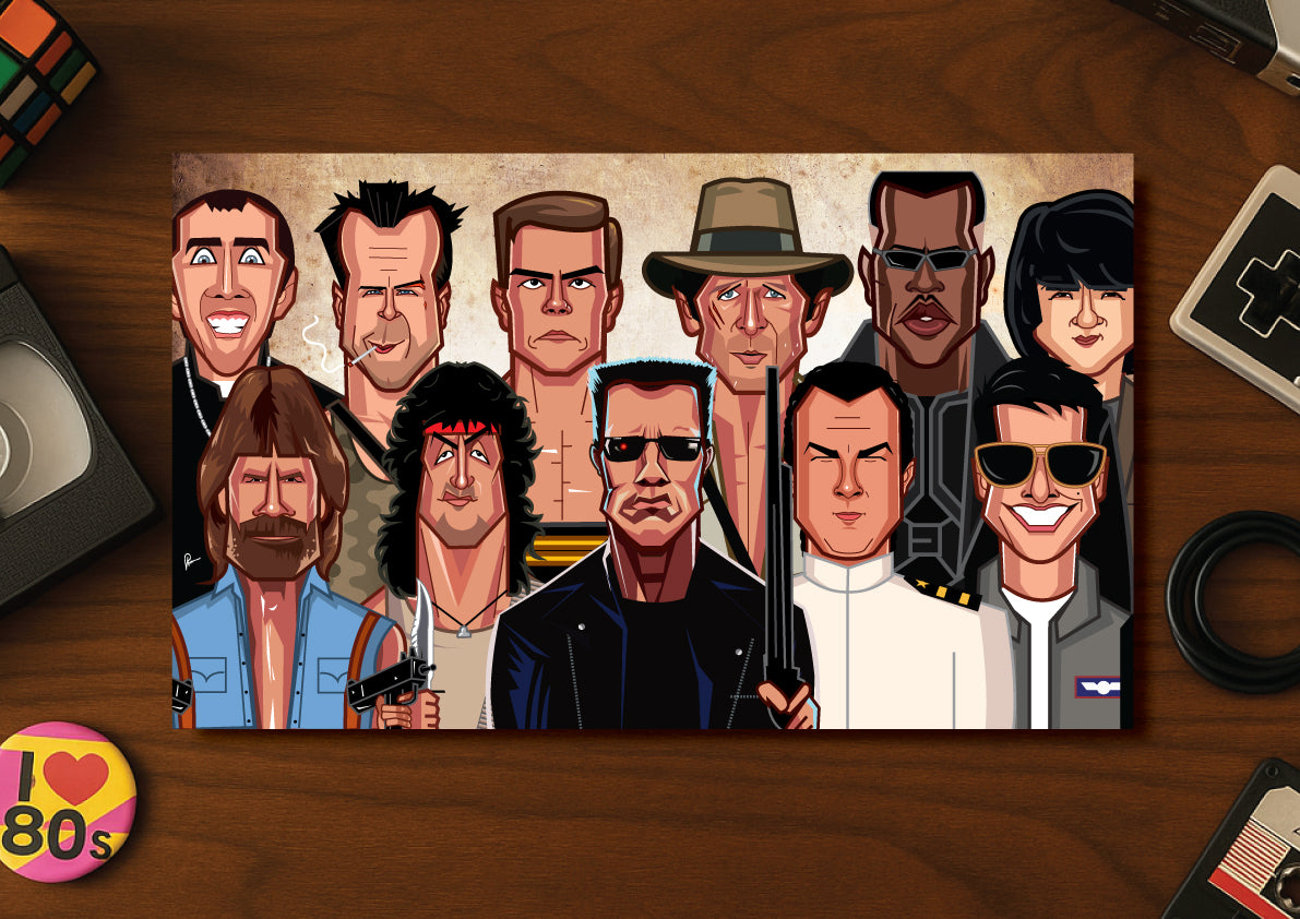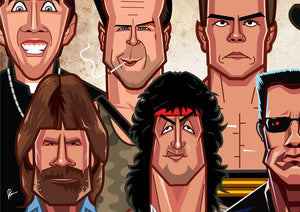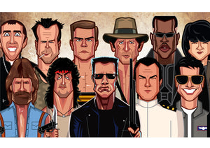 Say hello to the ultimate squad of 80s and 90s action heroes, a mugshot style digital caricature artwork that packs more nostalgia than your old VHS collection. This badass bunch includes legends like Arnold Schwarzenegger as the Terminator, Sylvester Stallone as Rambo, Tom Cruise from Top Gun and a lineup of other iconic movie characters that defined the golden era of Hollywood action movies.