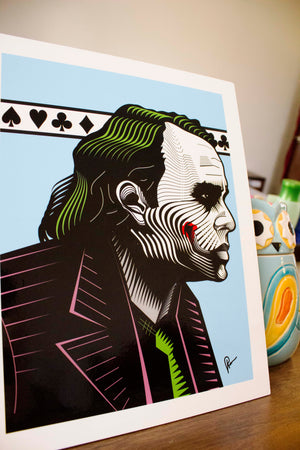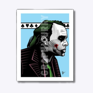 A vibrant tribute to master criminal and the one who made clown face analogous to a super villian. Caricature portrait in vintage stamp style infused with colors that will keep your eyes glued to the artwork!